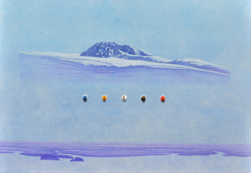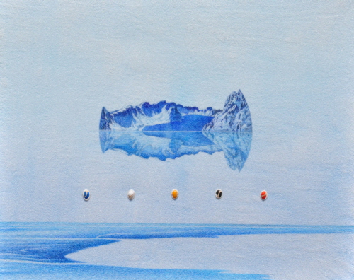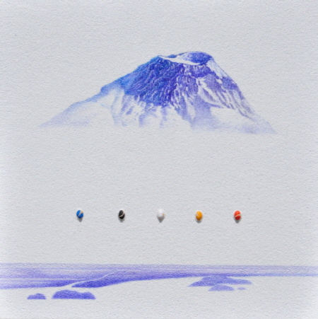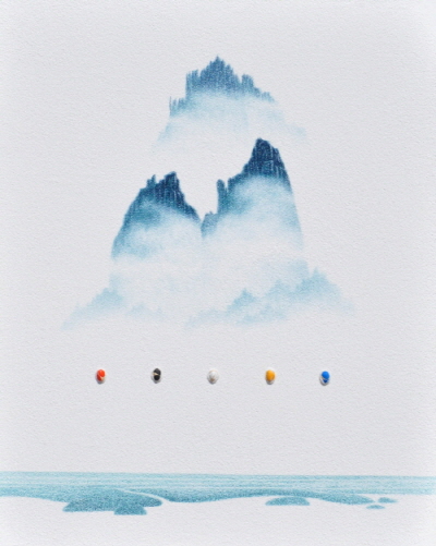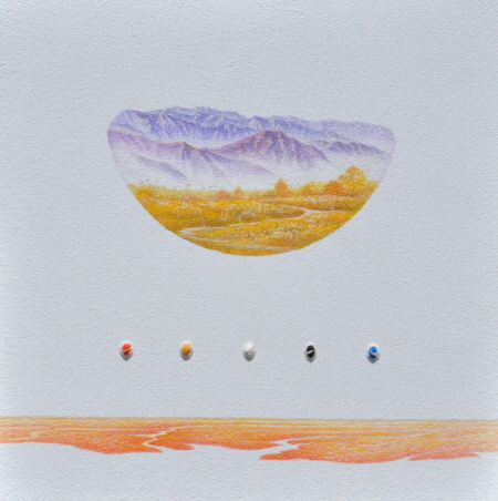 작가의 그림은 다분히 초현실적이다. 그가 좋아하는 초현실주의 화가 마그리트가 즐겼던 ‘데페이즈망(dépaysement)’으로 만들어낸 공간미다. 데페이즈망은 사물을 전혀 다른 공간에 위치시킴으로써 새롭게 보이도록 하는 조형 방법이다. 작가의 그림에서는 바다에 있을 섬이 하늘에 떠 있거나, 서로 분리될 수 없는 산과 바다가 추상적 여백으로 나뉘어져 있다. 때문에 그의 화면은 초월적 자연과 공간의 미학을 보여준다. 이는 평평하게 펼쳐진 석영 알갱이의 화포 위에 선명하게 드러난다. 고운 모래밭 같은 바탕의 마티에르(질감)가 형태의 잔잔한 시각적 움직임과 색채의 미묘한 순간적 변화를 연출한다. 이로써 작가의 그림은 그것이 놓인 환경에 따라 시각적 효과를 달리하는 느낌을 준다. 나아가 이러한 효과 위에 산과 바다 같은 자연 이미지가 더해지고, 다시 그 위에 나무줄기와 잎이 더해지면서 오묘한 초월적 공간성을 드러내기도 한다. 여기에 오방색을 입힌 씨앗을 화면에 붙여 같은 공간에서 조각과 회화가 조화를 이룬다. 오방색 씨앗은 마치 화룡점정처럼 그림에 생명을 부여한다. 이렇듯 작가의 그림은 구상과 추상, 회화와 조각이 융합한 새로운 조형예술이다.