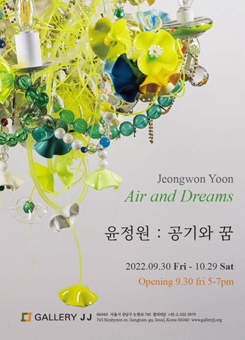 합리와 지성을 추구하는 현대 문명화 과정에서 인간이 잃어버린 것 중 하나가 환상적인 공간이다. 이러한 인간 본연의 욕망과 판타지를 시각화하는데 있어서 독보적인 행보를 보여온 윤정원의 전시가 갤러리JJ에서 다시 열린다. 2020년 《윤정원: 정령의 노래》 전시가 회화를 중심으로 진행되었다면, 2년 만에 같은 공간에서 열리는 이번 전시 《윤정원: 공기와 꿈》은 최근 새롭게 제작한 영상 작업을 선보이며 다수의 샹들리에 및 오브제 작업과 함께 공간을 아우르는 구성으로써 우리를 다채로운 조형의 세계로 초대한다.