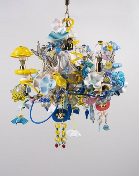일견 화려함으로 눈길을 사로잡는 샹들리에는 가까이 들여다보면, 플라스틱 목걸이와 인형, 유리구슬, 주사위 등 조그만 장난감이나 단추나 지퍼 같은 의류 부자재 등 기존 사물의 부속품으로써 주로 놀이용이나 장식으로 사용되던 것들의 조합이다. 그렇다면 인형이나 쓰지 않는 가방, 샹들리에에 형형색색의 옷을 입히거나 장식하는 일, 생활필수품보다는 재미있게 생긴 조그만 놀이용품을 모으고 집적하는 이 일련의 일들이 획득하는 예술적 실천은 무엇인가? 이러한 일들이 윤정원에게는 단순히 어린 시절의 추억 같은 노스탤지어적 행위가 아니라, 예술가로서 아름다움을 찾아가는 그만의 여정이며 자신이 가진 특유의 순수한 본성과 감각을 따라가는 일이다. 작가의 눈에 처음 들어온 바비인형은 장난감이기 전에 그가 상상하는 갖가지 색의 조합을 실험하고 입혀보기에 좋은 재료였다. 장난감 소품들은 유희적이고 재미있는 형태와 함께 자연 재료로는 구현할 수 없는 플라스틱 고유의 선명하고 다채로운 색감으로 선택된다. 아이들의 놀이 도구들은 이렇게 또 다른 의미에서 작가의 놀이 상대가 되어 주었다. 예술에서의 표현의욕이나 전달성 등 차이점에도 불구하고 애초부터 주술이나 제례 속에서 밀접하게 결합되었던 놀이와 예술은 자기목적적이며 현실이탈이란 측면에서 일정부분 공통점이 있다. 예술과 문화의 영역에서 인간의 정신은 놀이하기 시작한다. 어찌 보면 우리에게 익숙한 것들을 낯설게 하고 무한한 수의 새롭고 신기한 조합을 만들어내는 일이야말로 마냥 쉽지만은 않을 텐데, 작가는 놀랍도록 몰입하여 그 과정을 재미있고 신나게 해내면서 ‘놀이’라고 말한다. 그야말로 많은 사람들이 그의 작품에서 진정한 놀이 세계에서의 자유로움에 빠지듯 즐겁게 매혹당하는 이유일 것이다.