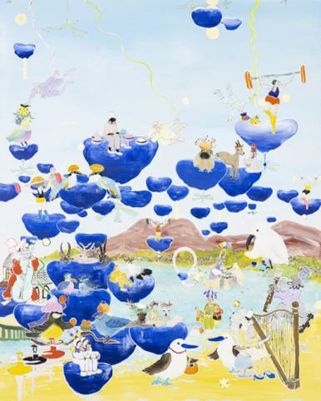 전시장의 공중에는 형형색색 신기한 샹들리에들이 별처럼 반짝인다. 플라스틱 꽃들이 만발하고 줄이 허공에서 드로잉을 하는 한편, ‘바비’ 오브제들이 벽면과 영상 속을 넘나든다. 작품 제목 가운데 <나처럼 한번 날아봐>가 있듯이, 그림 속 모든 존재자 역시 마치 무중력의 공간에 떠 있는 듯하다. 이러한 역동적 장면은 판타지 행성이나 원더랜드를 떠오르게 한다. 화면에는 날개 달린 천사와 새는 물론 발레리나와 악기 연주자, 프로펠러를 단 접시, 자동차가 무지개를 싣고 날아다닌다. 허공에 내려진 줄을 잡고 비행하거나 심지어 역기를 든 사람조차 거뜬히 공중부양을 할 기세다.