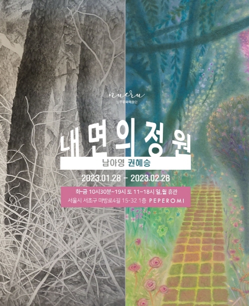서울시 비영리 민간단체 ’느루문화예술단‘이 주최하는 릴레이 전시 프로젝트 <오래도록 느루아트 시즌2> 네 번째 전시가 2023년 1월 28일부터 문화예술공간, 페페로미에서 진행된다. 권혜승, 남아영 작가가 참여한 전시 <내면의 정원(情園)>은 ’정원‘이라는 주제를 통해 인간 내면의 다양한 욕망, 심리상태, 감정을 바라보며 인간과 자연과의 관계를 풀어낸다. 남아영 작가는 자연 속 실재하는 대상에 자신의 감정을 투영하여 보이지 않는 요소를 화폭 속에 담아낸다. 마치 대상이 존재하는 공간을 정원으로 가꿔나가듯, 자연을 그리는 행위를 통해 마음의 휴식공간을 마련하고 이상적인 정원을 제시한다.