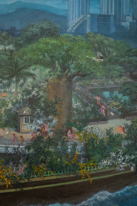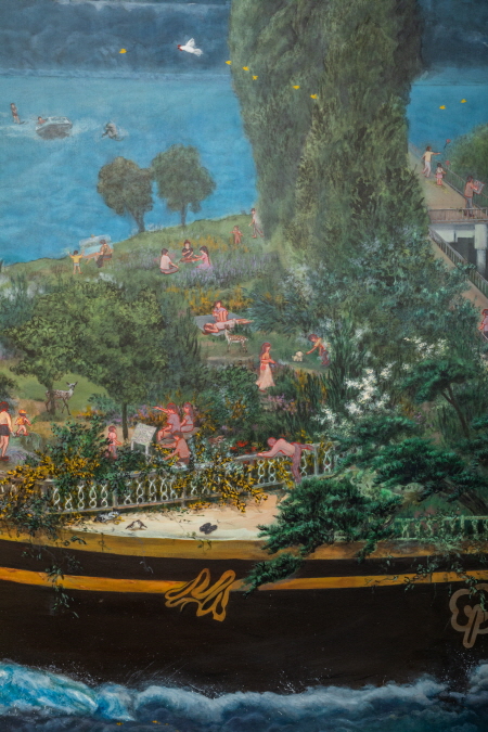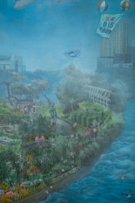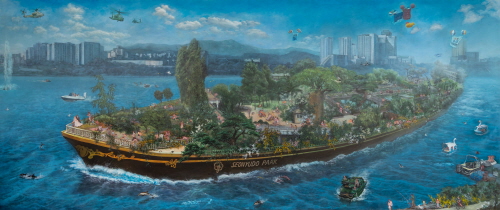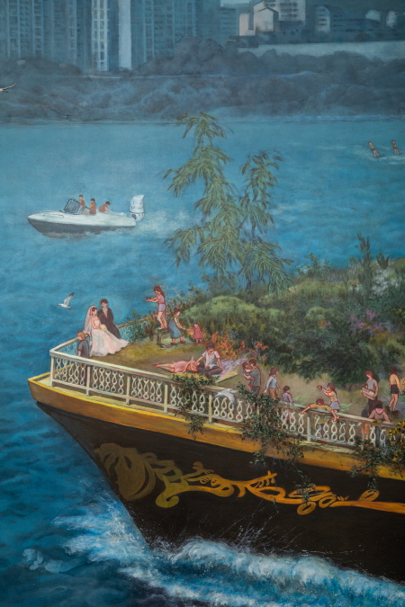 개인사와 현대사가 서로 뒤엉켜 춤추는 왈츠의 축제성이 느껴지는 이 그림은 ‘하늘엔 조각구름 떠 있고 강물엔 유람선이 떠 있고 저마다 누려야 할 행복이 언제나 자유로운 곳.’이라는 가요 <아!대한민국>의 낙천적인 가사로는 설명 안 되는 부분들이 숨어 있다. 하늘에 떠있는 애드벌룬, 배 주위를 따라 뛰어오르는 돌고래, 하늘을 향해 치솟는 대형분수, 배 주변을 따라붙는 수륙양용차, 하늘에서 감시하는 듯한 전투헬기는 선상의 행복감을 언제든지 무너뜨릴 수 있는 위협적인 요소들이며 은근한 불안감을 조성한다. 거대한 돛처럼 느껴지는 미루나무는 어느 누구에게는 동요 속의 낭만이 아니라 판문점 도끼만행사건을 연상케 하는 어두운 상징이 될 수도 있다.