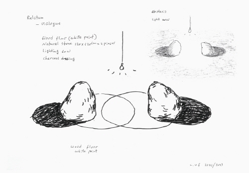 Drawing for 〈Relatum - Dialogue〉 2021/2023_Wood floor, white paint, natural stone, light bulb,