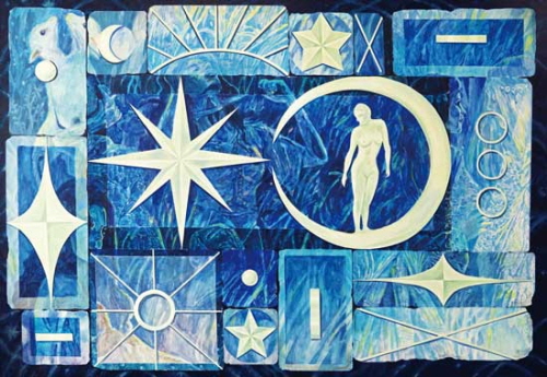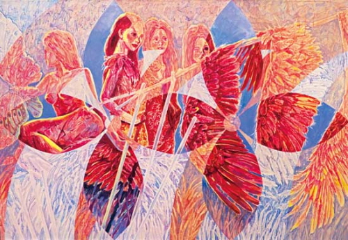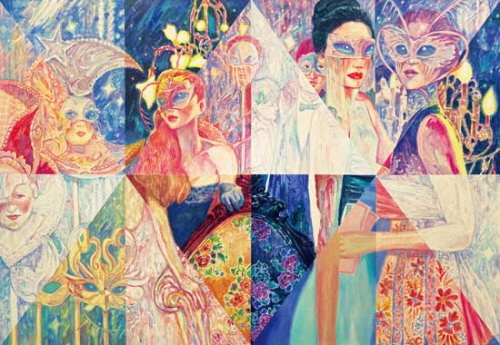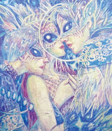 작업은 그리스 신화에 나오는 매우 아름답지만 치명적인 마력을 가진 세이렌을 모티브로 새로운 인물들로 재창조시켜 서사를 대변한다. 이는 단순한 대상이 아닌 의식이 내재된 현재를 살고 있는 물리적 주체로서 공상의 세계와의 매개체가 된다. 수분을 머금은 얇게 깔린 아크릴의 표현은 작가의 과감하고도 섬세한 붓의 터치를 잘 보여주며 마치 생동하는 듯 보는 이로 하여금 화면 속 세계로 깊이 끌어들인다. 깊은 심해인지 광활한 우주인지 알 수 없는 미지의 공간 안에서 인물 저마다 각자의 욕망을 드러낸 채 고요하고도 잔인한 전투를 준비한다. 가면을 쓴 인물들은 경쟁적이고 비인간적인 요소로 팽배해진 현대 사회를 살아가며 인간성을 상실한 본능과 욕망만 남아있는 듯한 시선으로 어딘가 응시하고 있다. 작가는 작품 속 인물의 보석처럼 빛나는 큰 눈과 보는 이의 시선이 마주하도록 의도하여 시선 너머에 숨겨진 진실 된 모습과 의미를 유추하는 과정을 이끌어 주며 작품과 끊임없이 소통하게 만든다. 이러한 맥락에서 눈이라는 소재는 효과적인 내면세계의 표출과 전달이 가능하기 때문에 그것만으로도 충분한 언어적 역할과 서사를 이룬다고 할 수 있다. 작품에서 가장 특징적인 것은 인물 위 또는 아래로 도형 형태의 레이어가 한 겹 덧입혀 보이는 점인데, 각각의 도형은 표면으로는 드러나지 않지만 우주와 영혼, 현실세계, 인간의 삶 등을 상징하는 밑바탕이 되어 심미적인 감성을 불러일으켜 감상에 재미를 더한다. 전반적인 작품을 구성하는 색채는 환상 속의 이미지를 만들기 위해 자연에서 가장 드물다할 수 있는 청색이 아우르는 파랑, 군청, 남색, 남보라 등의 색으로 채택하여 신앙적이고 고귀한 분위기를 자아낸다. 청색 계열의 색 조합은 섬세한 아름다움과 환희를 느낄 수 있음과 동시에 슬픔, 혐오 등 심리적인 동요를 일으키기도 한다. 또한 촛불의 푸른 부분이 가장 온도가 높은 것처럼 실재에 있어서 가장 높은 에너지를 응축하고 있는 색이라 할 수 있다. 이러한 해석에 따라 인물표현은 타의로 통제될 수 없는 강력한 힘을 가진 존재의 상징과 불멸의 상징으로 나타나 이상을 갈망하게 된다.