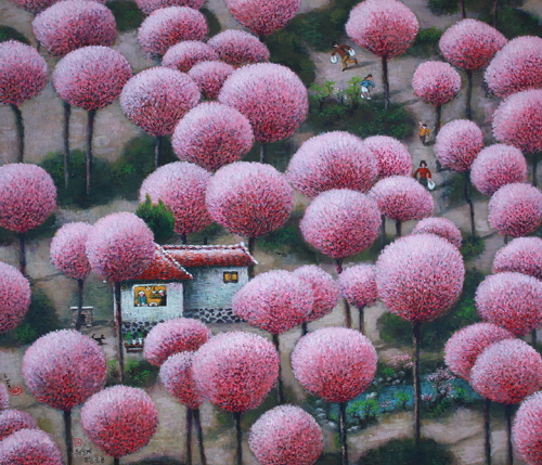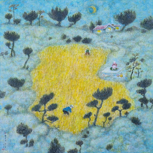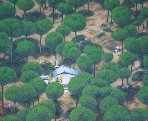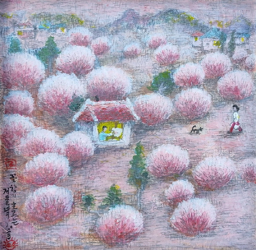 ‘봄 마당에서 되짚는 예술’하는 자세라는 전시 제목을 달고 있는 작가의 글에서 보는 것처럼 늘 오는 봄이지만 봄에서 작가들은 새로운 영감을 받기도 한다. 봄이 보다에서 온 명사형이란 말을 보면 당연한 것일지도 모르겠다. 봄꽃을 바라다보는 작가의 시선을 통한 봄을 느껴 볼 수 있다. 산천이 진달래로 그득한 산을 표현한 <꽃향기 흐르는 날>, <부모님께 가는 봄날>에서는 진달래빛으로 그려 넣고 있다. 가족과 모여서 같이 삶을 살아가는 안빈낙도의 즐거움을 최고로 생각하고 있는 작가의 생각을 엿볼 수 있는 <가족오복도>, <아빠 오시네>라는 작품에서 엿볼 수 있다. 가족이 모여서 사는 것이 소소한 행복 중의 하나임을 말하고 있다.