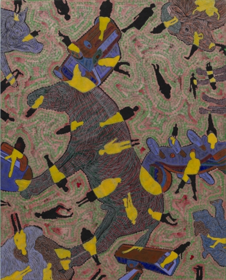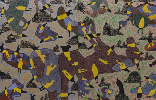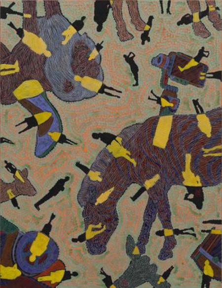 그러나 자세히 살펴보면 말, 사자 같은 동물이나 비행기, 핸드폰 같은 인공물들이 화면에 크게 자리 잡고 있고 이들 사이사이에 개체화된 인간들은 상대적으로 아주 작게 축소된 채 산발적으로 포진되어 주변 존재들과 부분적으로 접촉하고 있음을 알 수 있다. 여기서 눈에 띄는 것은 접촉지점인데 이것은 엄격한 경계를 유지하면서 화학적 상호작용을 거부하고 있는 모양새를 띠고 있다는 것이다.