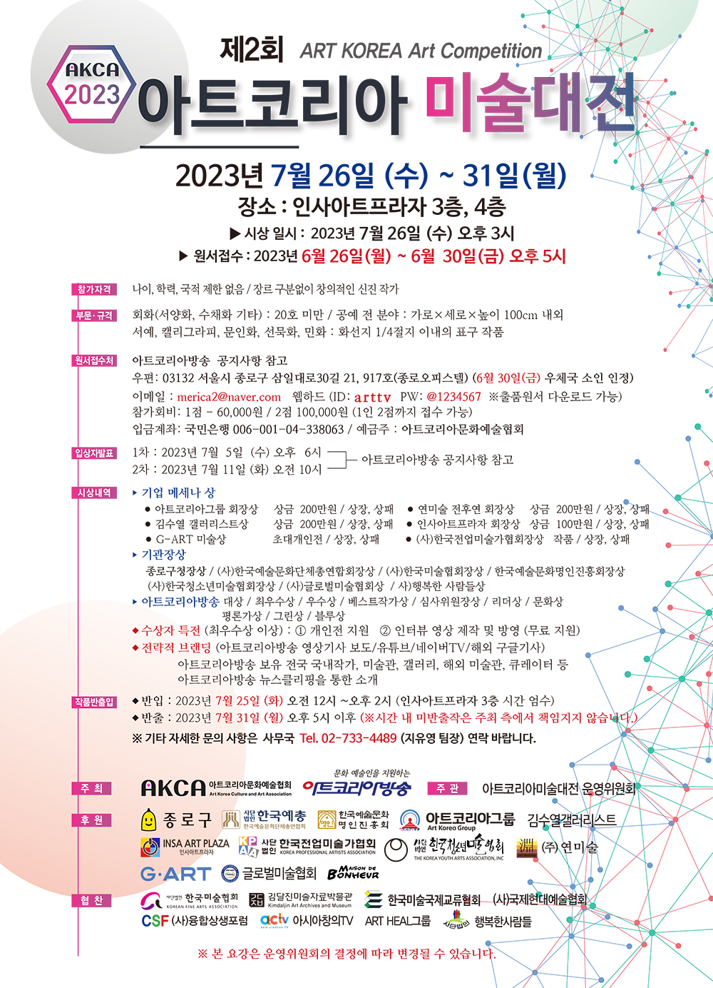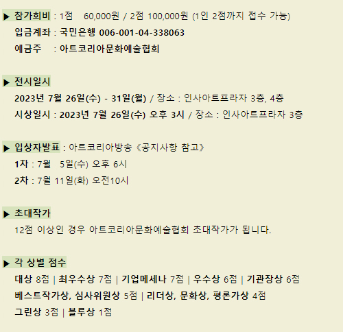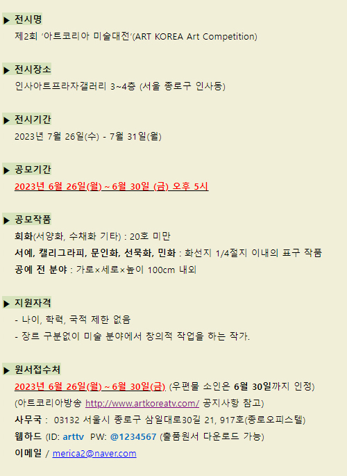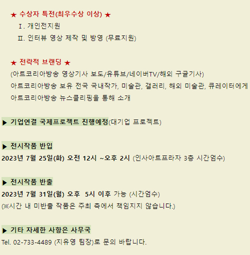 * 전시메일에 등록된 모든 이미지와 글은 작가와 필자에게 저작권이 있습니다. * vol.20230626-제2회 아트코리아 미술대전 |