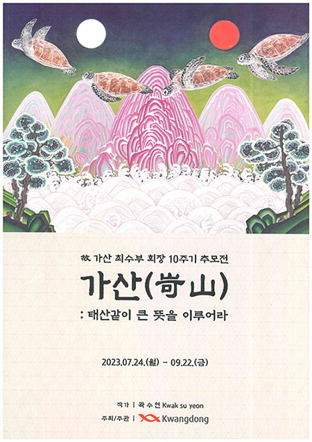 광동제약은 창업주 故 최수부 회장의 10주기를 맞이하여 2023년 7월 24일부터 9월 22일 까지 한국화 작가 곽수연의 개인전 <가산(岢山) : 태산같이 큰 뜻을 이루어라>를 개최한다. 그 동안 인간과 친근한 반려동물들을 그려온 곽수연 작가는 광동제약의 상징인 거북이를 통해 가산 최수부 회장과 광동제약이 걸어온 길을 돌아본다.