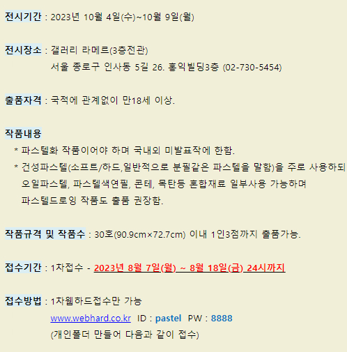 * 전시메일에 등록된 모든 이미지와 글은 작가와 필자에게 저작권이 있습니다. * vol.20230807-2023 제33회 한국파스텔화 공모대전 |