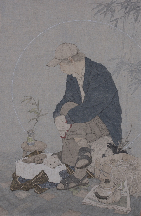 청나라 화가 여덟을 그린 양주팔괴(揚州八怪)에 빗대어 춘천의 예술가들을 그린 <춘주팔괴>는 김홍도의 <군선도(群仙圖)>와 신윤복의 <주유청강(舟遊淸江)>을 뒤섞었으되, 얼굴은 춘천의 여덟 예술가들이다. 제소리로 제 삶의 ‘참꼴(眞身)’을 짓는 예술가들이 신선으로 나타났으니 그들 모두가 ‘참나’ 아닌가. 어디 그뿐이랴. <앉아있는 개>도 불성(佛性)을 가진 존재요, <광명상회> 아주머니도 홀로 아득히 깨달은 부처로 그렸다. 아주머니의 수인(手印)은 천하유아독존이다. 서 있는 자리가 솟구친 자리다.