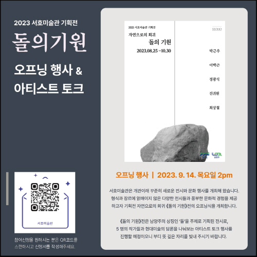 인류는 일찍이 선사시대(先史時代)부터 ‘돌’을 활용한 각종 도구를 만들어 왔고 이를 다시 선사예술(先史藝術 Prehistoric Art)로 재탄생시켰다. ‘돌’이나 ‘나무’를 조각한 조형물, 수많은 원시 동굴 벽화와 암각화 등이 바로 그것이며, 초기 인류가 동굴 속에 그림을 그렸다는 것은 인류 문명사에 중대한 사건이다. 여기에 고인돌을 비롯한 선사 예술에는 ‘돌’이 있었음을 떠올릴 수 있다. 그리고 서호미술관 본관이 위치한 남양주시 화도읍 ‘금남리’의 ‘돌’이 남양주 지역 주민들 선조의 삶과 회귀의 역사를 기억하는 중요한 존재로 소개되고 있으며 ‘돌’은 지역 주민들의 역사와 문화를 보존하고 있는 가치를 지닌다.