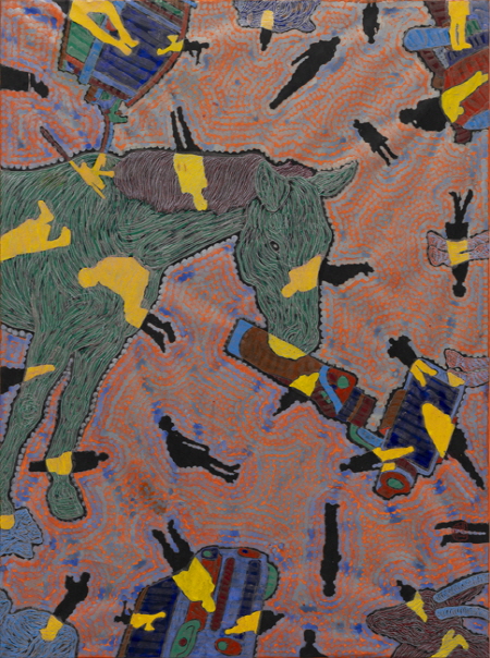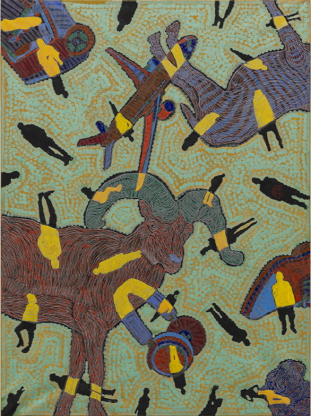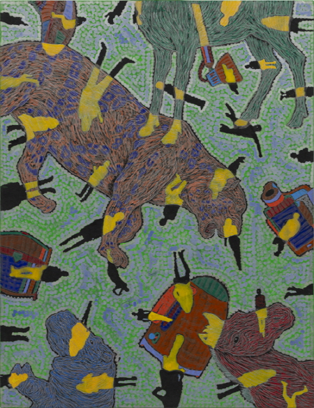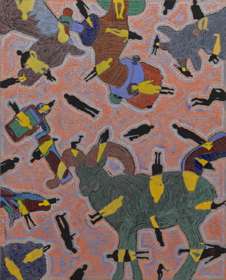유목동물인간문명시리즈 유목동물인간문명시리즈는 역동적 야생동물의 묘사를 통해 자본문명에 젖은 기계적 삶에 예속된 현대의 삶을 탈피하여 자연 본성에 가까운 자유로운 세계로 인도하고자 한다. 작가는 인간조건의 근원을 위협하는 문명의 파괴적인 양상을 주목하고 문명과 인간탐구의 영역에서 동물을 부가(자연)하였다. 문명과 부유하는 인간 연작 위에 실루엣의 점묘로 대담하게 처리한 동물이미지는 문명의 온갖 단서와 익명인간이 오버랩 되면서 파편화되고 비순환적인 현실을 강렬한 색채로 부각시킨다. 문명의 월권과 그 파괴적 양상은 조화상실의 디스토피아적 상상과 함께 인간형상을 더욱 왜소하게 만들고 있으며 주체적 관계상실을 동물과 문명의 제반 이기를 부각시킴으로써 표현했다.