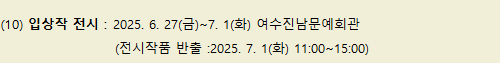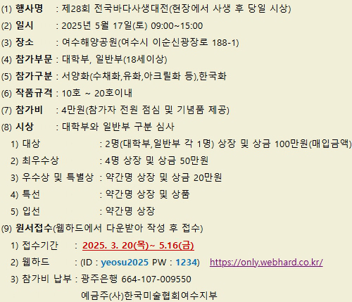 기타 자세한 사항은 요강 참고 및 한국미술협회 여수지부로 문의 바랍니다. 위원장 : 010-8607-3530 | 지부장 : 010-3643-6014 | 사무국장 : 010-7644-3446