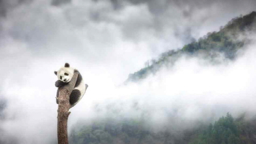 A giant panda in Sichuan, Soouthern China, in a foggy morning_2019