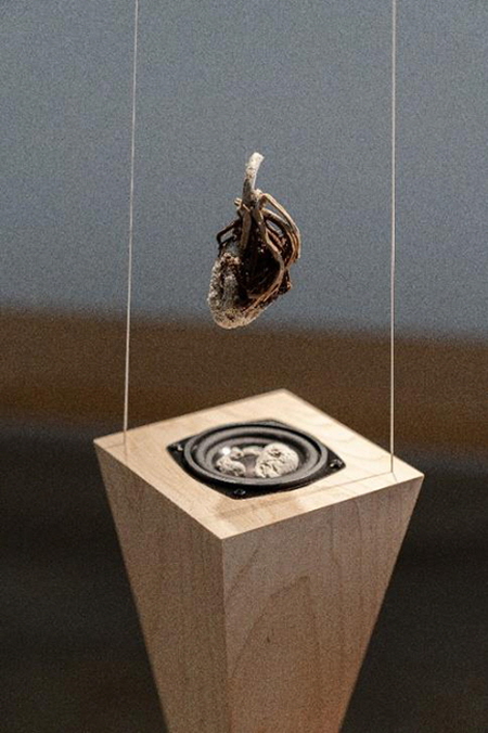 김준 作_깊은 우물, 2024_복합매체(목재, 스피커, 앰프, 건조된 식물, 수집된 암석들, 3채널 사운드)_가변크기