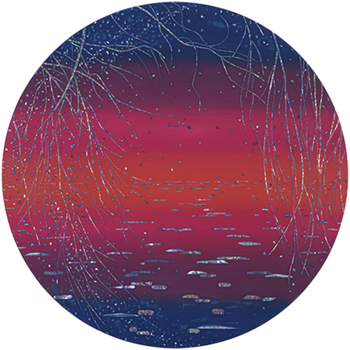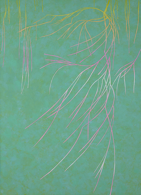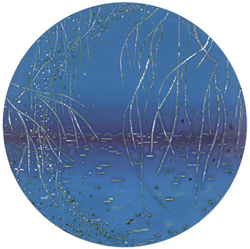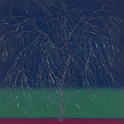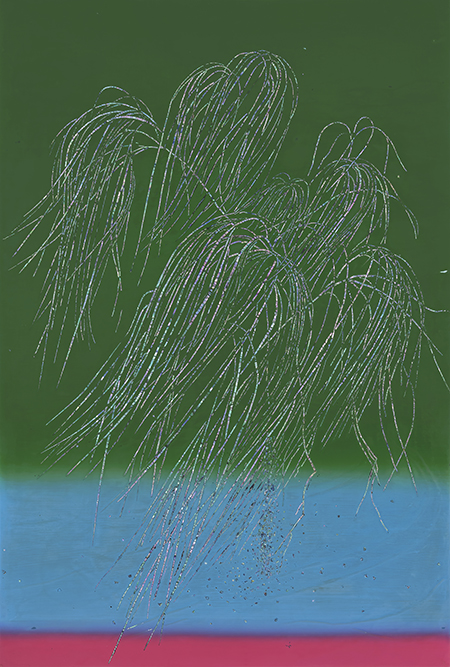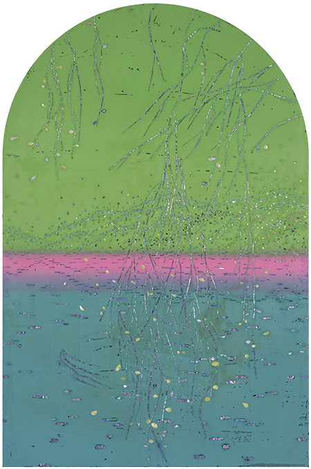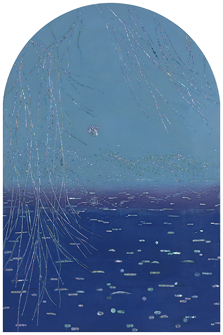 그렇게 작가의 그림에서 색감만 놓고 보면, 단색이나 수평선이 중첩된 것 같은, 아득하고 막막한 느낌의, 화면 안쪽으로 깊이를 만들면서 확장되는 것 같은, 그러므로 어쩌면 자연의 본성에 부합하는, 심플한 화면 구성이 미니멀리즘을 상기시키고, 색면화파의 추상회화를 떠올리게 만든다. 자연감정 그러므로 평소 자연에 대한 작가의 감정이 자기표현을 얻고 승화된 형식을 얻고 있다고 해도 좋을 것이다. 그 위에 작가는 버드나무와 때로 불꽃놀이와 같은 일상적인 소재를 자개로 붙여 표현하는데, 작가의 그림에서 버드나무와 불꽃놀이는 각 정형과 비정형이라는 차이를 제외하면 서로 통하는 부분이 많다. 자개를 세로로 길게 잘라 마치 점을 찍어나가듯 연이어 붙여 고정하는 끊음질 기법을 구사하는데, 부드럽고 유연한, 불어오는 바람에 반응이라고 하듯 허공을 흔드는 버드나무 가지를 표현했고, 일정한 패턴을 그리면서 일시에 쏟아져 내리는 불꽃을 표현했다. 여기에 외부의 빛에 반응하는, 그렇게 카멜레온처럼 시시각각 변신을 보여주는 자개의 빛깔이 아마도 가녀린 띠가 만드는 섬세한 감각이 관건인 끊음질 기법에 최적화된, 형식과 내용이 부합하면서 감각적 쾌감을 주는 경우라고 생각된다. 소금호수에서 올려다본, 칠흑 같은 밤에 투명한 깊이를 만들면서 발광하던 별빛 이후, 때로 소멸을 위해 추락하는 유성이 보여준 비현실적인 풍경 이후, 자연의 본성 그대로를 고스란히 포획한, 자연이 주는 감동으로 사로잡는, 그런 경우라고 생각된다. 아마도 미묘한 색층(그러므로 차이 나는 색감)을 포함하고 있는 심플한 색면 구성과 대비되면서 더 돋보이는 경우라고 생각된다. 영화에 보면, 로드무비라는 장르영화가 있다. 삶을 길에 빗댄 영화고, 잊힌 자기, 진정한 자기, 자기_타자를 찾아 나서는 여행에 빗댄 영화다. 작가의 작업이 그렇다. 작가는 자기를 찾아 세상 끝에 선다. 사막 위에 서고, 소금호수 앞에 서고, 버드나무 앞에 선다. 그렇게 작가에게 세상 끝은 버드나무에도 있었다. 그리고 아마도 일상 속에도. 그리고 우리가 서 있는 지금 여기에도.