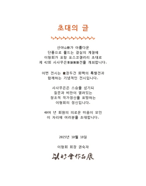 포항의 문화 명소인 ‘포스코갤러리’의 초대로 열리는 이 전시는 여러 면에서 기념비적인 의미를 가집니다. 전시의 부제는 <사사무은>으로, 그 함의(含意)는 ‘스승을 섬기되 질문과 비판에 열려 있는 창의적인 예술세계 추구’로 이는 창의성의 발현을 통한 예술창작을 표방하는 이형회의 작가정신과 일맥상통한 것입니다. 요즘 시대 보기 드문 아름다운 주제입니다. 이런 정신은 우리 삶에 훈훈한 인간다움을 느끼게 합니다. 이형회는 그림으로만 영향을 미치는 단체가 아닌, 예술정신에서도 세상을 변화시킬 수 있는 내면의 색과 형태와 철학을 지닌 ‘참예술인들’이라고 자부합니다. 이 뜻깊은 전시의 성사를 위해 많은 노력을 기울여주신 포항의 작가님들께 감사드리며, 찾아가는 미술관 프로그램을 <초헌 장두건 展>으로 구성하여 함께 전시함으로써 한층 의미를 깊게 만들어 주신 포항시립미술관 관계자님들께도 심심한 감사를 드립니다. 그들은 포항 예술의 뿌리인 화백의 작품과 유품을 포항시립미술관에 유치하는 일에도 정성을 다하였습니다. 이런 노력과 열정과 의리를 계기로 이형회가 더욱 도약하리라 믿습니다.