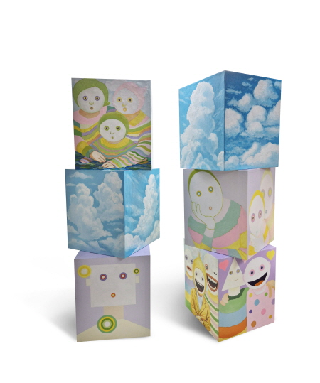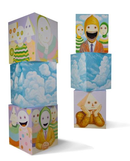 작업실 구석에서 먼지를 뒤집어쓴 채 스무 해를 묵은 상자들(60x60x70cm)이 다시 나를 불러냈습니다. 나는 그 위에 하늘을 그리고, 세모·네모·동그라미로 얼굴을 빚어 인물을 형상화했습니다. 단순한 도형들은 해학을 머금은 채, 불안과 희망이 뒤섞인 인간의 모습이 투영되어 있습니다.