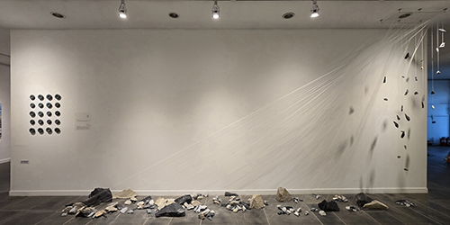 한희선 作_석편(石片), 남겨진 이야기_보령 오석,강화 화강암, 명주실_가변설치_2025