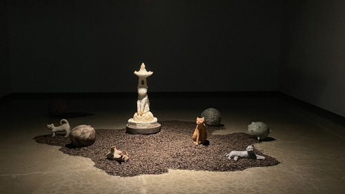 최순임 作_위로의정원2025_고양이석등_세라믹40x40x90_고양이4p, 행성3p, 소나무껍질, 식물들_가변설치_2025