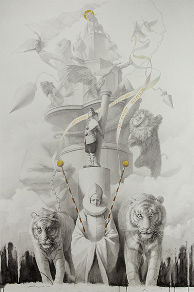 전시엔 두 점의 탑 드로잉이 소개된다. 한 점은 <신념의 탑>이다. 인간의 삶의 여러가지 모습들을 상징화했다. 탑을 쌓을 수 있을만큼 다양한, 인간들이 가지는 어리석은 신념들을 형상화해 묘사하고 있다. 다른 한 점은 <영원의 탑>이다. 균형과 자연, 3이라는 숫자를 상징하는 형상들을 찾아 표현하고 있다. 전시와 함께 소개하는 동명의 소설상에는 사피에르가 그린 그림으로 소개되고 있는 탑 드로잉이다. 소설에서는 실제 그림이 존재하지 않는다는 전제를 두고 있다. 탑 드로잉 외로 12점의 드로잉을 더 볼 수 있다. 1년이라는 시간은 12개의 달로 이뤄져 있다. 작가는 이번 전시에서 숫자들이 상징하는 의미에 집중하고 있다. 12개의 드로잉을 1년이라는 순환하는 시간에 배치하여 삶의 다양한 이야기를 풀어낸다. 두 점의 조각 중 한 점은 영원의 탑 꼭대기에 있는 인물을 재현하고 있다. 자연을 상징하는 플로라(flora)를 입체로 구현한다. 다른 한 점은 작가가 만든 소설 속에 두 개의 깃발을 들고 있는 인물(깨어나지 않는 아이)을 묘사한다. 이 조각들은 바닥에 반사되며 전시장에서 2개의 상을 만들어 낸다. 이 전시를 관통하는 2라는 상징은 도처에서 발견된다. 전시장 입구에선 2개의 깃발을 볼 수 있다. 소설 속에 나오는 깃발을 전시공간에 재현한 것이다. 하지만 실제 소설 속에서 깃발의 형태는 구체적으로 묘사되어 있지 않다. 작가는 소설 속의 깃발의 재현이라기보다는 전시 전체의 총괄적인 의미와 상징들 전달의 목적이라 말한다. 깃발 역시 인간의 숫자인 2와 신의 숫자 3에 관련된 상징들이 곳곳에 배치되어 있다.