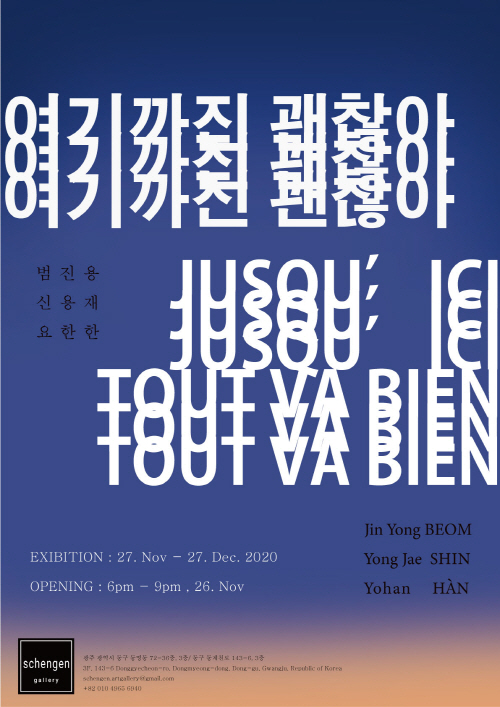 <여기까진 괜찮아, 여기까진 괜찮아, 여기까진 괜찮아 (Jusqu' ici tout va bien, Jusqu' ici tout va bien, Jusqu' ici tout va bien)>은 Schengen gallery 개관전시의 제목으로 프랑스 영화 <La Haine, 1995>의 대사를 인용한 것이다. 당시 프랑스 사회의 이민자 문제를 다루며, 영화 속 세명의 젊은이의 삶을 통해 현지인이면서도 이민자일 수밖에 없는 불안한 심리와 묘한 긴장감을 표현하고 있다. 이러한 맥락을 시작으로 전시는 오늘날 급변하는 환경 속에서 각기 다른 세 명의 작가가 느끼는 생태학적(Ecologic), 심리적(Psychologic), 사회적(Sociologic) 표면을 회화, 드로잉, 설치, 사운드 퍼포밍 작업을 통해 표현한다. 환경은 언제나 인간의 생활반경과 직접적인 상호관계를 맺으며 변화해왔다. 그것은 자연적 질서와 조직, 인간과 외부세계의 친화적 또는 불화적 관계의 반복이었을 것이다. 이러한 생태학적 접근은 결국 어떠한 상황적 관계 속에서 인지되는 인간의 심리 상태와 직관적으로 연결되어 있으며, 우리는 끊임없이 변화하는 환경 속에서 주위를 세심히 관찰하고 기록해야 할 의무가 있다. 왜냐하면 그 중심에 인간이 자리하고 있기 때문이다. 세 명의 작가가 표현하는 환경의 형태는 다양하면서도 공통적인 방식이 존재한다. 그것은 아마도 세상과의 관계에서 시작되는 작가 개개인의 심리적 상태가 어떠한 ‘불안성'에서 시작된다는 점이다. 범진용의 회화에서 느껴지는 모호한 경계와 불분명함은 현실과 이상(꿈)이 중첩 돼있는 자연의 풍경으로 나타나는데, 그 안에는 황폐함 속에서 거칠게 자라나는 강한 생명력이 존재한다. 마치 문명의 흔적이 사라진 후에 나타나는 자연의 풍경과도 흡사한데, 여기서 작품의 압도적인 스케일에 존재하는 자연적 풍경은 관객을 흡수해 버릴 것만 같은 몰입감을 안겨준다.