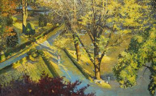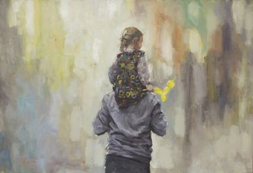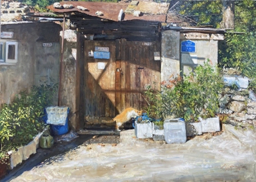 작가의 그림을 보고 있으면 재미있다는 생각이 든다. 형태가 분명한 자연스러운 회화의 성격이 잘 드러나 어렵지 않고 편안한 느낌을 주지만 자세히 살펴보면 추상적인 표현으로 겹쳐진 물감층이 더해진다. 인물이 담길 때도 자연만 표현되는 경우에도 누군가 다녀간 흔적처럼 공간의 깊이가 확인된다. 구체적이나 낯설고 어느 곳인지 알 수 없는 신비감이 더해지는데 이는 사물에 부여되는 빛이 자연스레 섞여 뒷받침되는 덕이다. 풍경화라 볼수 있지만 형태는 다양하다. 사람과 사람이 마주해 대화를 나누고 집들이 모여 있어 지붕이 잘 보이기도 한다. 나뭇가지와 잎들이 햇빛을 받아 반짝이는 모습은 단순하면서 아름답다. 수평적 구도를 전제로 형태들을 따라가다 보면 이곳은 평범하고 매일을 살아간다는 점에서 도시의 범주를 벗어나지 않는다. 카페의 실내공간 또는 공원 안 벤치에서 휴식을 취하고 있는 사람들을 보고 있으면 작가의 관심사는 도시 안 어떤 것을 목격한다기보다 무심결에 나오는 행동이 관찰되는 것에 관심이 있는 듯하다. 인물의 개별적 성격을 찾기보다 담담하게 세상을 바라보는 태도로 사람들을 보편적 성격으로 묶어 놓는다. 5년간의 러시아 레핀 유학 생활에서도 인물화는 빼놓을 수 없는 주제였지만 개별적 존재성은 이내 풍경으로 어울린다. 해외 다양한 인물들, 자연을 그려보면서 작가가 찾은 것은 어떤 것일까? 아름답다는 느낌으로 인물과 자연은 조화롭다. 인류애는 뒤로하고 고독함 보다는 공존을 담고 있다. 그림들은 깊이 들어가면 저마다의 사연이 있으니 어려워지고 관찰되는 것만 이야기하면 단순해진다. 이것이 사실적 풍경으로 리얼리즘이다. 형태와 색채를 관찰하다 보면 그래서 재미를 느낀다. 감성적이다. 작가는 회화가 전해주는 선한 영향력을 믿는 것 같다. 온기로 받는 느낌은 그 이전 시대 고전도 떠올려 보지만 그것과는 거리가 멀다. 특정 시간의 빛이 아닌 어느 시절의 빛, 따뜻함을 보여주고 싶어 한다. 추억처럼 다가올 수도 있는 행복한 순간, 붙잡고 싶은 지속의 순간이 더해졌다. 회화의 힘으로 평면 안에서만 이라도 사람들은 즐겁다. 각자는 이미 극복되는 경향이 있다. 뜻하지 않게 우리는 비대면이라는 단어를 일상어처럼 사용하기 시작했고 나를 포함한 사회는 빠르게 변화하여 디지털 시대를 살아가고 있다. 이 순간 개인은 어떤 것을 버리고 선택하며 살아야 할까? 요즘처럼 일상이 소중한 때도 없을 듯하다. 도시를 생각하면 삶에 수반된 모든 것들을 이루어 놓은 터전이니 문화도 있겠다. 처음엔 누군가의 불편함을 해소하고자 시작되었을 터인데 점점 늘어나 개인이 해야 할 일도 많아진 듯싶다. 우리는 같이 사는 것일까 아니면 따로 사는 것일까. 각자가 모여 같이 사는 사회인걸 알면서도 고민이 많아지는 건 어쩔 수 없는 현실이다. 그가 그린 풍경을 보고 있으면 삶의 버거운 모습을 보여주지 않더라도 연상되는 것들이 있다. 우리는 이렇게 살고 있노라고 보여주는 듯하다. 자전거를 타다 돌아보는 아이 아니면 할머니가 강아지를 반기는 모습은 왠지 모를 따뜻함으로 그리움이 깃든다.