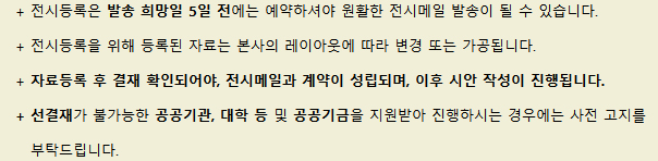 - 2007년부터 전시게재 · 메일링서비스 비용 동결 - 작품 이미지(jpg) 10컷(기본), 기본 작품 이미지에서 추가 시 1컷당 11,000원의 추가금이 발생합니다. - 전시 일정 및 장소 - 전시 관련 글 (필수 사항은 아닙니다.) - 프로필 (간단 프로필) *필수 사항은 아닙니다. (단, 모든 참여작가 E-mail 필수) Hwp : ▷전시 게재양식 다운로드 // PDF : ▷전시 게재양식 미리보기