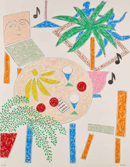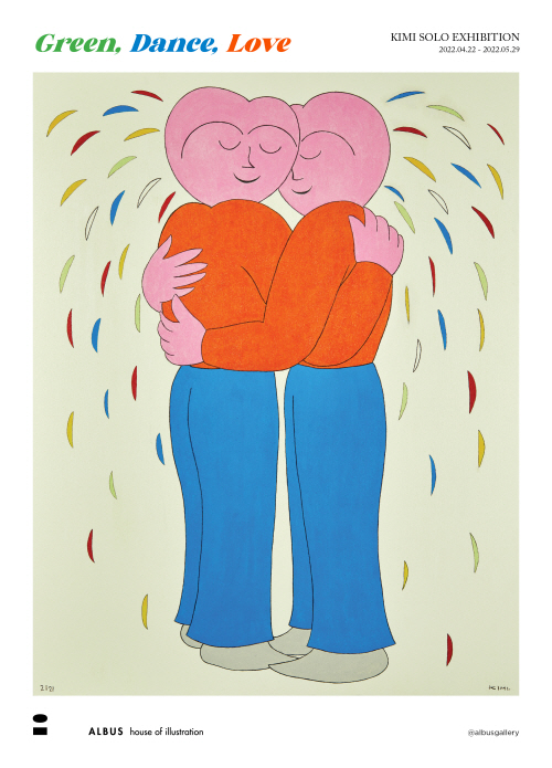 알부스 갤러리는 2022년 4월 22일부터 5월 29일까지 키미 작가의 < 그린, 댄스, 러브 Green, Dance, Love > 개인전을 개최한다. 키미 작가는 ‘키미앤일이 KIMI AND 12’라는 예명으로 부부가 함께 부산에서 작업 활동을 하고 있으며 그림을 그리는 ‘김희은’, 디렉팅과 글을 쓰는 ‘김대일’에서 지어진 이름이다. 환경보호와 비건을 지향하는 삶에 관심을 두고 변화된 생활 방식과 사유를 확립해가며 자신의 시선과 경험을 공유한다. 일상 곳곳에서 발견할 수 있는 사랑에 관한 관념을 담아낸 신간 그림책 『LOVE』를 새롭게 선보인다. 사람과 자연의 유대 관계와 순환하는 삶을 다각도로 보여줌으로써 모두에게 이로운 삶의 방식과 우리의 주변을 다시 한번 바라보게 한다. 캔버스와 종이 위에 무채색으로 선을 그리고, 자연으로부터 영감 받은 색을 면으로 채워나가며 생동감 있는 형태를 만든다. 주변에서 흔히 볼 수 있는 풀, 과일, 그릇 등의 물상을 소재로 유연하고 다양한 시점으로 시선이 머무는 것들을 기록한다. 푸릇한 풀과 그에 맞춰 자유로이 춤을 추는 무용수의 움직임은 공간 안에서 율동감과 리듬감을 더해준다. 가볍고 경쾌한 붓 터치와 과감한 화면 구성으로 작가가 추구하는 찬란하고 아름다운 세상을 그려내며 이야기를 이끌어낸다. 이번 전시는 작가의 생각과 가치관을 함께 엿볼 수 있는 ‘그린, 댄스, 러브’, 세 가지 주제로 나누어 선보인다. 그동안 해온 작품들과 더불어 새롭게 시도한 규모 있는 캔버스 작품과 그림책 『LOVE』의 원화 작품, 드로잉 및 영상 작품을 만나볼 수 있다.
