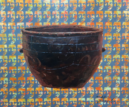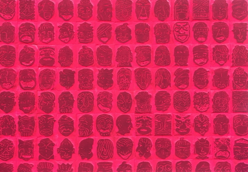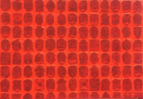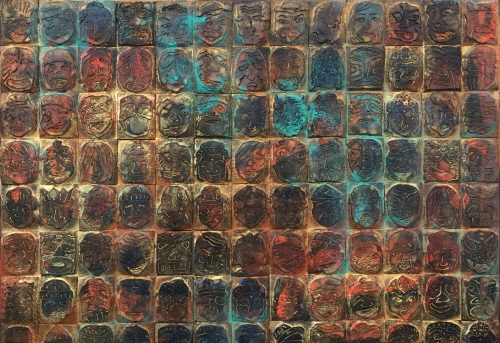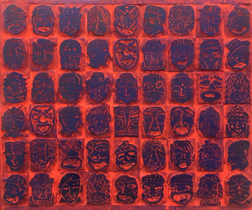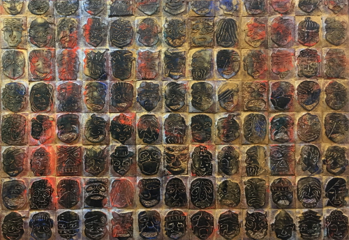중견작가 이동수는 반복의 원리를 제한된 사각의 화면/평면에 구현한다. 이동수 작가의 최근 작품도 이전과 마찬가지로 시리즈이지만 구성원리가 달라졌다. 시리즈인 <천의 미소>(2019-2020)가 대표적이다. 사각이라는 제한된 틀 안에 수많은 얼굴의 형상들이 상하좌우로 그려져 있다. 화면 속 인물의 형상을 표현하는 붓질과 색채는 시리즈의 다양성을 담보한다. 색채와 붓이 회화의 도구이자 반복원리를 가늠하는 기준이 되었다. 기하학적 요소가 상하좌우로 나란히 배열되었다. 그렇게 구분된 사각형의 틀 안에 얼굴의 형상들이 붓으로 채색되어 빈틈없이 빼곡하게 채워졌다. 화면은 기하학적 배치와 형상의 이미지들로 인해 요철(오목과 볼록)로 보인다. 단색조로 시각화된 얼굴의 형상들은 차가운 배치의 원리에도 불구하고 각기 다르다. 눈, 코, 잎, 이마, 머리 등 표정은 세심한 관찰을 요구한다. 사각이라는 회화의 본질이 한 화면에 다시금 상하좌우로 균일하게 구획된 사각형, 그 안에 얼굴의 이미지들이 독립적으로 자리했다. 전체적으로 마치 수제도장 같아 보인다. 더더욱 글자의 이미지가 인물의 형태와 손을 잡았을 뿐만 아니라 판화와 회화적 특성도 배합된 시리즈다. 작품 제목이 지시하듯이 천의 얼굴들, 그 미소가 작품제목을 지시한다.