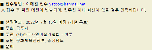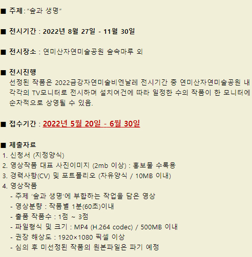 * 전시메일에 등록된 모든 이미지와 글은 작가와 필자에게 저작권이 있습니다. * vol.20220520-2022 금강자연미술비엔날레 자연미술영상전 작품공모 |