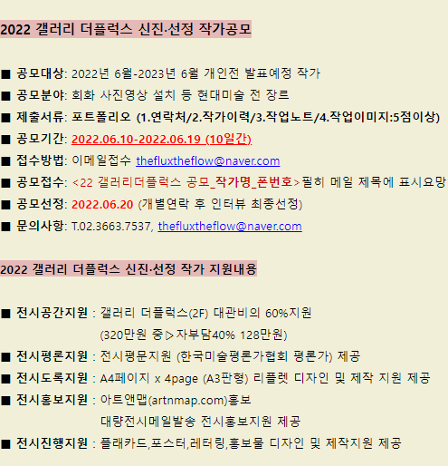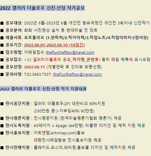 2022년 하반기 개인전을 준비하는 작가분들을 위해 갤러리 더플럭스와 갤러리 더플로우 공간에서 신진작가 공모 및 선정작가 공모 프로그램을 진행합니다. 한국 현대미술의 새로운 경향을 선도할 작가를 매년 공모를 통해 선발하며 아래와 같은 개인전 프로그램에 따라 전시를 진행하고자 합니다. 본 공모에 선정된 작가는 전시기간 동안 전시평론 및 전시홍보 등을 지원받게 되며 전시 이후 성과에 따라 본 갤러리가 진행하는 아트페어 및 다양한 전시기획에도 참여할 기회를 드리게 됩니다.