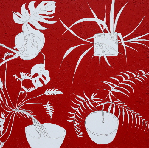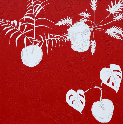 (중략) 실제로 그의 작업실에는 그 식물들이 그러한 형태로 살아 있다. 화분에 담기거나 물컵에 담은 구근이 싹을 틔워 올리거나 생수병에 담긴 상태로 말이다. 그려진 화분의 형태를 보면 쉽게 짐작할 수 있듯이 그것들은 가드닝을 위해 보기 좋게 꾸민 것들이 아니라, 여기저기에 버려져 있는 것들을 주워 모으거나, 식재료로 놓아둔 것에 싹이 트면 어쩔 수 없이 기르게 된 것들이다. 파의 꽃을 보기 위해 파를 기르는 사람은 없다. 하지만 파를 키우다보면 흰 꽃이 핀다. 그리고 그들도 수명이 있어 꽃이 지고 잎이 시들어 생명을 다한다.