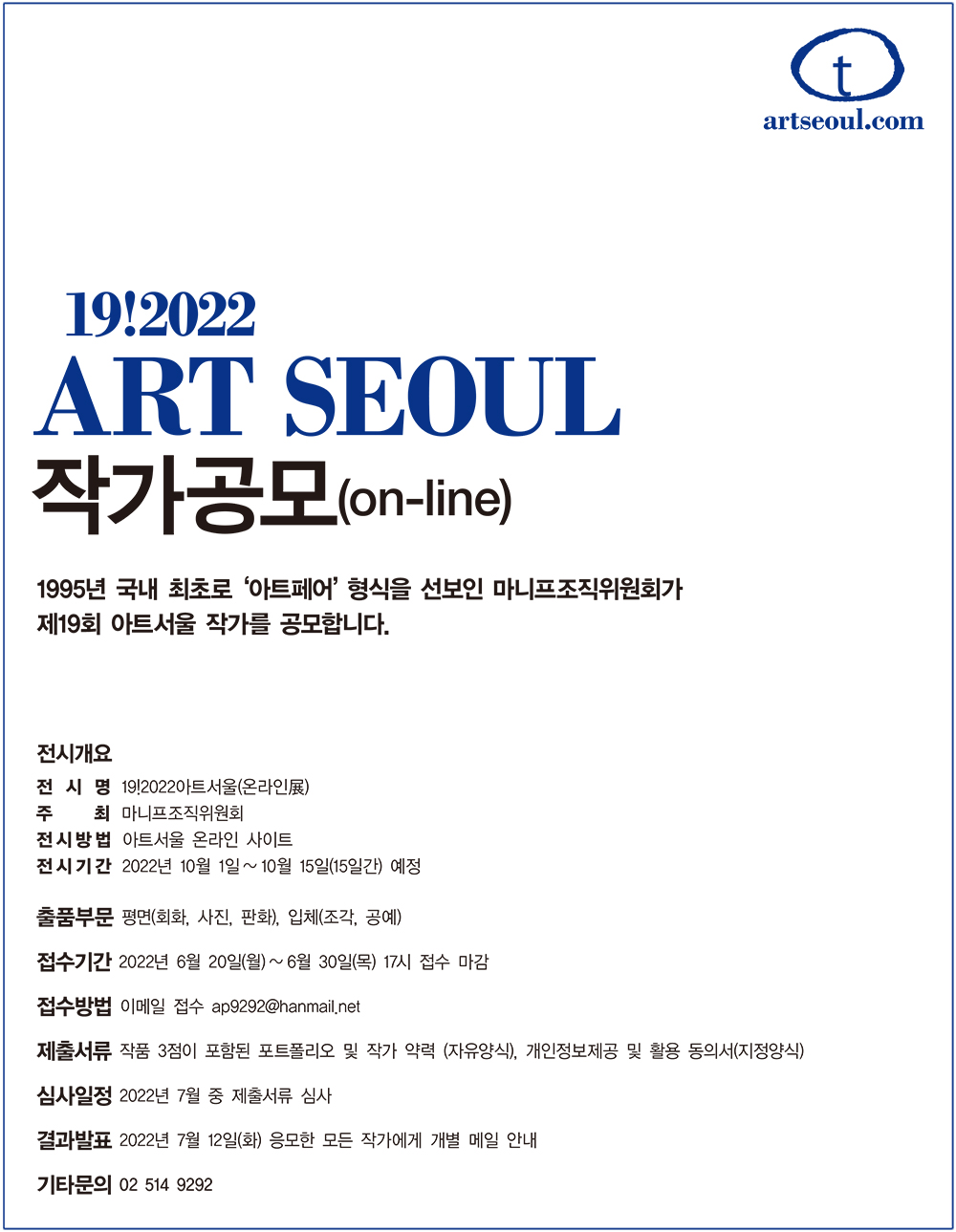 * 전시메일에 등록된 모든 이미지와 글은 작가와 필자에게 저작권이 있습니다. * vol.20220620-19!2022아트서울 작가공모 (온라인 전) |