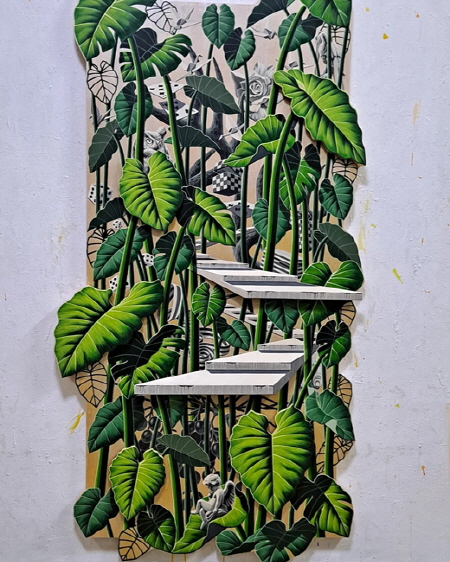 한지선 작가는 화면을 구성하는 요소들은 계단과 무성한 잎들, 그리고 다양한 이미지들로 이루어져 있다. 다양한 이미지들은 권위, 교만, 축적, 은폐, 욕심, 허망함, 바램, 경쟁, 비밀 등의 의미로 곳곳에 등장되어진다. 잎은 자연적인 힘의 상징이며 계단은 삶의 과정인 길이다. 다양한 이미지들과 거대한 잎들의 대치와 그 곳에서 이어지는 계단은 자연스럽게 치유되어지는 회복과 복귀를 의미하는 희망적인 메시지를 전달하고 있다.