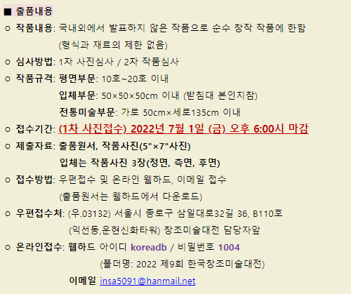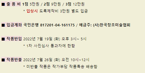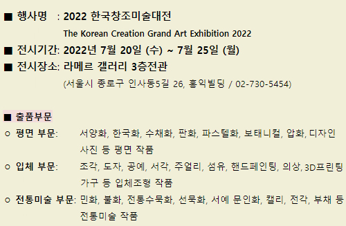 * 전시메일에 등록된 모든 이미지와 글은 작가와 필자에게 저작권이 있습니다. * vol.20220701-2022 제9회 한국창조미술대전 |