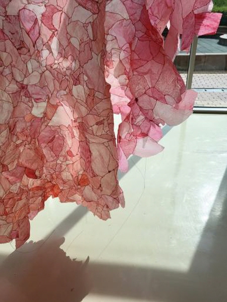 전시 ‘자라나다’에 선보이는 작품 ‘Life’는 2004년부터 2022년 현재까지 제작된, 앞으로도 진행될 장기 프로젝트이다. 작품은 다양한 붉은 색감의 아크릴 물감으로 채색한 트레이싱 종이들을 건조 후 찢어 그 조각들을 실과 바늘로 손바느질로 이어가며 제작되었다.