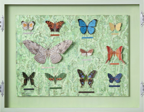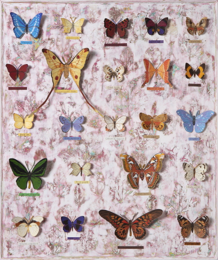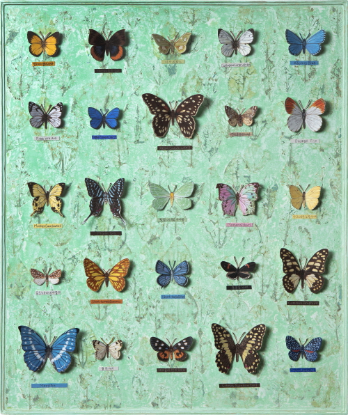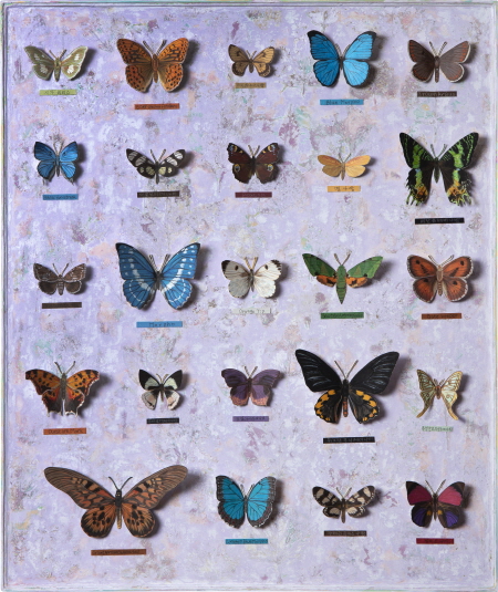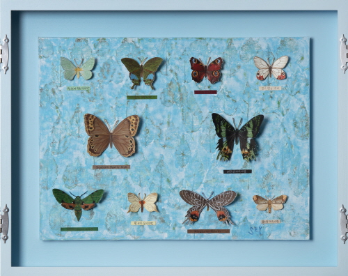 처음 나비를 채집하기 시작했던 사람은 어떤 생각이었을까? 집 앞 마당에 자라난 꽃들 위로 사뿐히 내려 앉은 나비를 본다. 들판을 거닐 때 바람을 타듯 유유히 날아다니는 나비를 본다. 그 작은 생명체 안에 내재된 여유로움, 존재의 신비함을 본다. 마음에 나비가 들어온다. 나비의 몸을 감싸고 있는 오묘한 색채와 무늬, 형태의 고혹적인 아름다움. 기본의 형상으로부터 변주되어 나온 다양한 생김새. 헤아릴 수 없을 만큼의 개체 수. 그 모든 나비가 완벽하게 조화롭다. 어떤 것은 수수하고 또 어떤 것은 독특하게 화려하고 또 다른 것은 어두운 색으로 덮여 있지만 반짝임이 풍겨 나와 눈부시다. 하나하나 그 자체, 존재의 가치가 있다. 그때 그 사람은 나비의 아름다움, 다양함을 이웃과 함께 즐기고 싶었을 것이다. 그리고 더 깊이 들여다보고 연구하여 남기고 싶었을 것이다. 나비가 화면 위로 내려앉을 때 우주의 질서를 소소하게 담아내고 싶어 가로 선과 세로 선을 설정해 보았다. 가로 선과 세로 선이 만나는 지점에 나비를 놓는다. 간혹 다른 지점에 놓을 때도 있지만.... 나비의 모양과 무늬, 색과 크기의 조화를 본다. 서로 간의 어울림을 두고두고 본다. 나비가 놓였던 자리에 다른 생명체를, 사람들을 놓아두는 것을 상상해 본다. 다양한 사람들의 군상을 머릿속에 그려 본다. 모두, 다른 생김새와 개성과 사상을 가진 사람들... 한 사람도 같은 사람은 없다. 나비가 모두 다른 모습을 가졌듯이... 다름을 인정한다. 서로를 받아들인다. 그러다 보면 세상은 평화로워질 것이다. 평화로운 세상을 꿈꾸어 본다. 작가노트