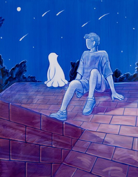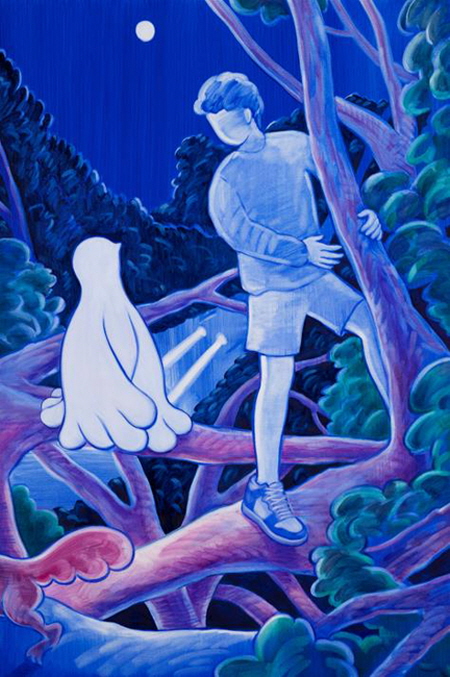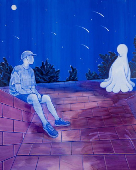 달빛과 핸드폰 화면에서 발산되는 빛을 근거 삼아 밤을 파랗게 시각화 하며 높은 채도의 푸른 밤 속을 누군가 걸아가는 시점의 기존 회화들에서 높은 산자락에 어지럽게 얽힌 나무 사이에서 배회하는 모습이나 지붕 위에 앉아있는 모습 등 기존에 작가의 회화에서 보이던 시점보다 약간 고도가 높아진 상태의 장면들이 등장한다. 마치 중력을 거스르려 하는 듯 높은 곳을 찾아 올라가고 탐색하는 모습의 단편들 같기도 하다. 대지 위를 감싸던 공기보다 한 층 푸른 밤공기들로 감싸진 높은 곳들에 오르는 그들을 포착한 어느 어슴푸레한 밤의 이야기. 어느새 그들을 둘러싼 시공간은 사라지고 '밤' 그 자체에서 오는 시지각이 화폭 안으로 들어오며 붓질과 레이어로 이루어진 황홀하고 신비로운 이야기가 펼쳐진다.