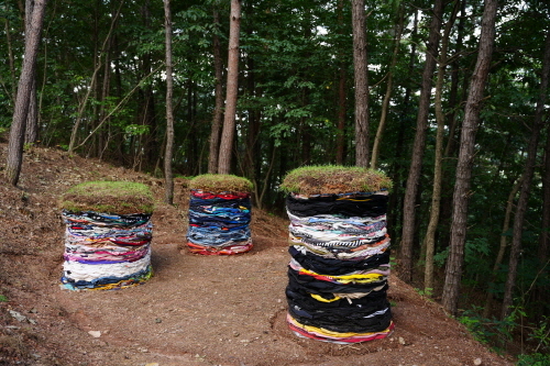 또,다시야생전_홍이현숙 作(한국)_은닉된 에너지, 각종 입었던 옷들_ 옷, 흙, 씨앗_200x100x150(H), 110x180(H), 110x170(H)cm