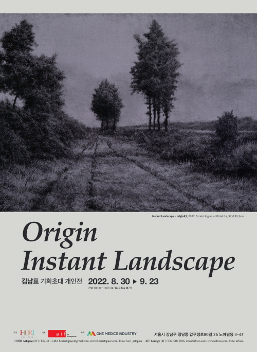 김남표 작가의 기획초대 개인전 'Origin-Instant Landscape'이 8월 30일부터 9월 23일까지 개최됩니다. 이번 개인전에 선보이는 '인조 모(毛)에 바늘을 이용한 스크래칭 기법'으로 제작된 작품들은 보는 이의 눈을 의심케 할 정도로 섬세함의 극치를 보여 줍니다. 우선 3층 호리아트스페이스는 '인조모 스크래칭' 기법의 그림들로 꾸며집니다. 의도적으로 액자를 하지 않아서 머리카락 굵기의 세밀한 인조모 결들이 바늘을 만나 어떻게 조율됐는지 직접 확인할 수 있습니다. 반면 4층 아이프라운지는 유화 작품들로 꾸며집니다. 역시 빛을 최대한으로 절제한 검은 풍경들입니다. 아주 소량의 달빛에 파도가 출렁이는 밤바다 풍경이거나, 빙하의 흔적을 품은 몽블랑 고봉(高峯)의 신비로움을 전합니다. 미술평론가 이진명은 서문에서 김남표 작가를 '본질주의자이며 진정한 회화주의자, 숭고의 실천자'라고 평했습니다. 그만큼 이번 '검은 풍경' 신작들이 회화가 지닌 본질적인 힘을 증명해주기 때문입니다. 가장 단순함과 완결함의 미학이 얼마나 아름다움의 근원으로 이끌어줄 수 있을지, 김남표 작가의 첫 인조모 검은 풍경 개인전에서 확인하시길 바랍니다.