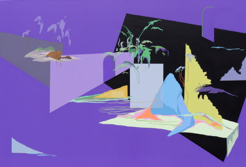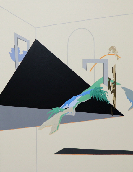 화면 위의 건축물과 자연은 프레임 또는 구조적으로 단순화된 면으로 배열된다. 중첩된 프레임과 면으로 이루어진 화면 위에 공간은 안과 밖의 경계가 모호하디. 이렇게 화면에 재구성된 공간은 확산되거나 축소되기도 하여 낯익지만 낯선 공간으로 나타나는데, 그것은 차원이 다른 질서로의 도약을 기대케 한다. 화면을 자유로이 넘나드는 선들은 무한한 공간으로의 연결점이자 유동적인 의식의 흐름을 반영한다. 그 선들 사이에 유영하듯 배치된 형상들은 화면에 새로운 질서를 만든다. 이를 통해 보는 이에게 낯익기도 하지만 동시에 묘하고도 낯선 것으로 다가간다. 대상의 해체와 재구성 그리고 왜곡된 형태를 통해 비일상적인 의식의 흐름과 같은 시간성을 엿볼 수 있을 것이다. 또한 형태의 반복으로 이루어진 공간은 잠재된 가상의 세계를 암시한다.