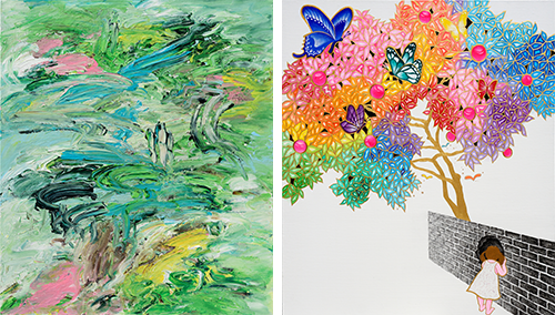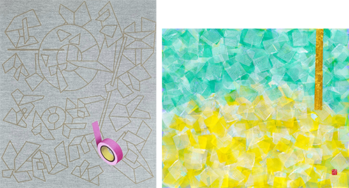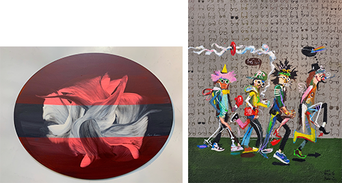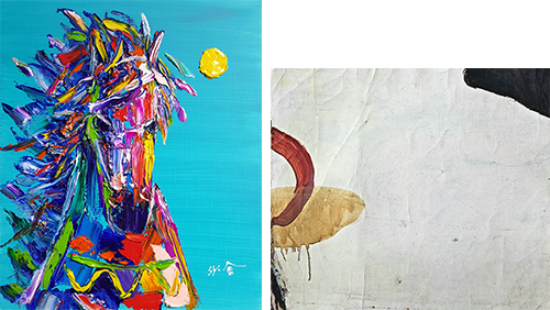 이안 리 作_Untitled_Acrylic on canvas_40.0x50.3cm_2020 (좌) 이은황 作_Don't stop along the way_Mixed media on Canvas_53x45cm_2022 (우)