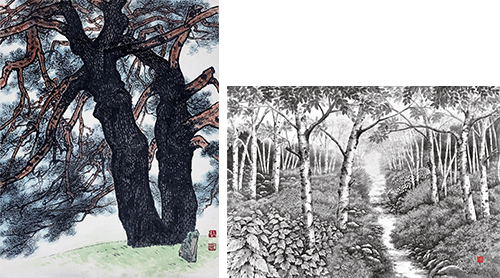백범영 作_세월(歲月)_한지에 수묵담채_41x33cm_2022 (좌) 서권수 作_자작나무숲길_수묵_46x53cm_2022 (우)