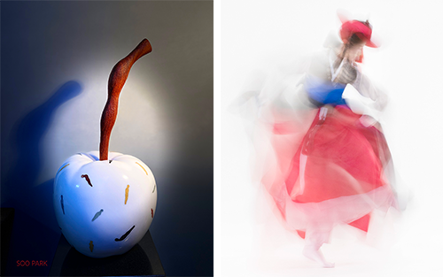 수박 作_광대-Apple_대리석,wood_30x30x61cm_2021 (좌) 양재문 作_비천몽#32m_ed 4-10_pigment print on Hanji_58x40cm_2021 (우)