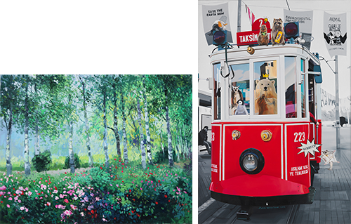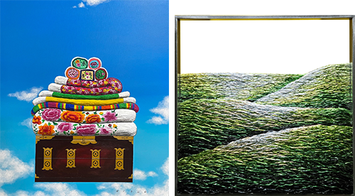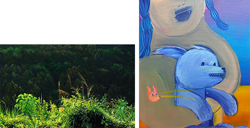 류재현 作_Breath of wind201118_oil on canvas_33.4x53.0cm_2011 (좌) 만욱 作_따뜻하고 시원한 바람은 모두에게 와주었네_acrylic on linen_41x53cm_2022 (우)