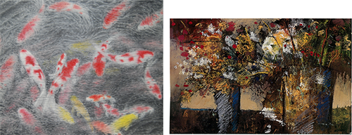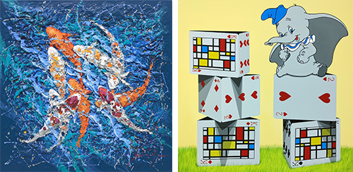 전미선 作_the Pisces-KOI 447_Mixed media on canvas_45.5x45.5cm_2022 (좌) 전병택 作_The tower of card-Dumbo_oil on canvas_50.0x50.0cm_2021 (우)