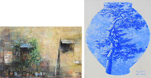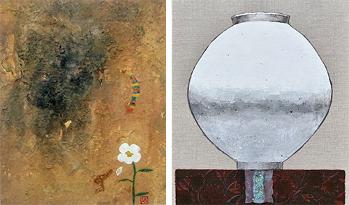 고제민 作_도시산책 스미다_oil on canvas_53x40.9cm_2020 (좌) 구명본 作_솔을 품은 달항아리_oil on korean paper on canvas_53.0x45.5cm_2022 (우)