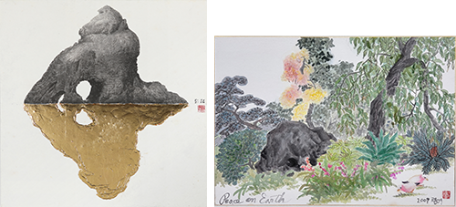 이철규 作_독도무진도(獨島無盡圖) Eternal Dok-do_한지에 수묵 순금박 개금_40x40cm_2021 (좌) 이환범 作_땅에 평화_화선지에 먹과채색_35x50cm_2009 (우)