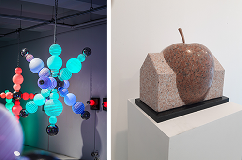 이후창 作_Shining Light, Shining Life, Shining Us(빛나는 빛, 빛나는 삶, 빛나는 우리) _Glass, Steel, Light_130x130x145cm_2021 (좌) 이훈 作_삶-꿈에관계하다-Big Apple_화강석_35x30x35cm_2022 (우)